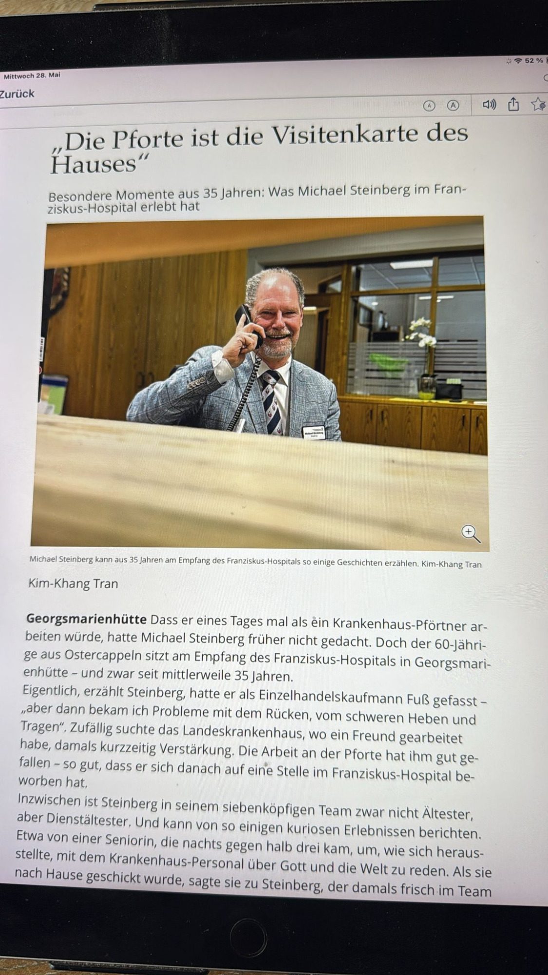 Ob eine Geburt am Empfang oder ein Video als Impfausweis: Michael Steinberg hat in seinen 35 Jahren am Empfang des Franziskus-Hospitals in Georgsmarienhütte schon so einige kuriose Dinge erlebt. Warum er dem Job des Krankenhaus-Pförtners treu geblieben ist – und welchen Wunsch er an Besucher hat.